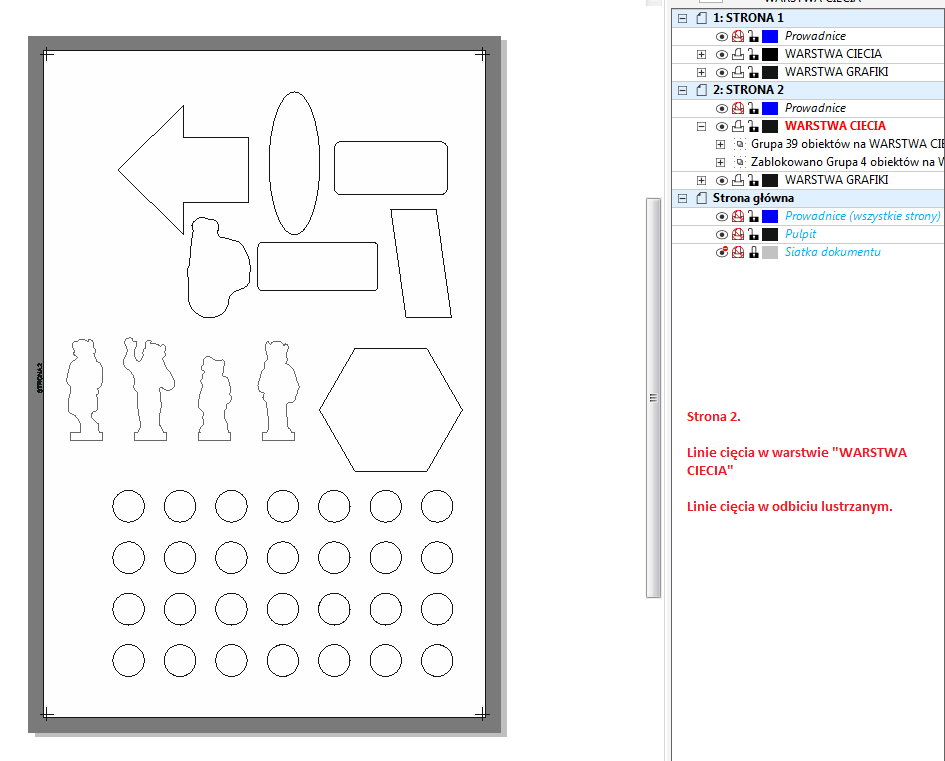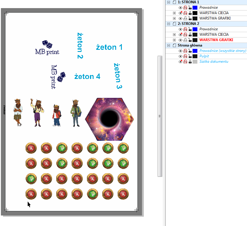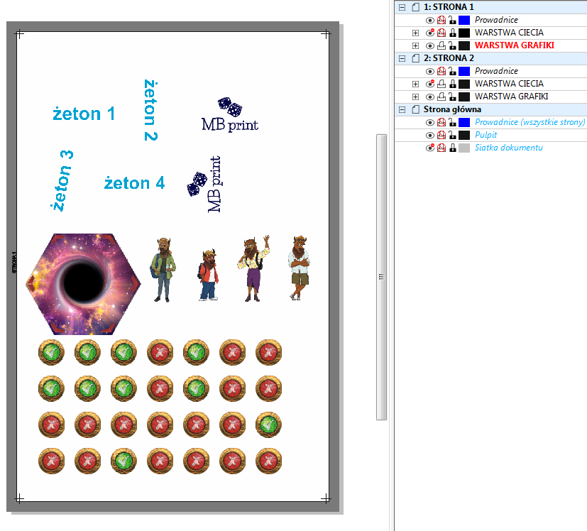 Instrukcja przygotowania pliku z żetonami, planszetkami i innymi elementami tekturowymi W MB PRINT dbamy o najwyższą jakość druku. Poprawne przygotowanie plików wpływa na efekt końcowy gry. Sprawdź nasze wskazówki, aby Twój projekt wyglądał perfekcyjnie również po wydruku. Żetony/Planszetki Karty Pudełka tekturowe spód-wieko Plansze składane Instrukcje Playmaty Pudełka karciane jednoczęściowe Makieta do projektowania żetonów Dopiero zaczynasz przygodę z samodzielnym przygotowywaniem żetonów do druku? Ułatwimy Ci zadanie! Pobierz instrukcję PDF Makieta do układania żetonów Podstawowe zasady przygotowania pliku do druku Format pliku: PDF. Rozdzielczość: 300 DPI. Kolorystyka: Preferowany tryb CMYK (profil Coated Fogra 39), pliki RGB zostaną automatycznie przekonwertowane co może wiązać się z różnicą w odcieniu kolorów. Głęboka czerń: by uzyskać głęboką czerń, użyj składowych: C:30% M:30% Y:0% K:100%. Spady: Dodaj 3 mm grafiki tła z każdej strony wszystkich żetonów poza format docelowy (np. żeton 20 x 25 mm powinien mieć ze spadem 26 x 31 mm). Margines bezpieczeństwa: Ważne teksty i grafiki umieść minimum 2 mm od krawędzi formatu docelowego (netto). Tekst: Wszystkie czcionki muszą być zamienione na krzywe. Znaczniki: Nie dodawaj linii cięcia ani paserów przy zapisie. Spłaszcz warstwy przed zapisem. Usuń efekty przezroczyste. Krok 1 Przygotowanie grafik pojedynczych żetonów Zanim zaczniesz układać żetony na arkuszu zbiorczym, musisz poprawnie przygotować plik graficzny dla każdego pojedynczego elementu. Aby wydruk był profesjonalny, każdy żeton musi spełniać dwa kluczowe warunki techniczne: mieć dodany spad oraz zachowany bezpieczny obszar. 1. Kluczowe definicje Spad drukarski (3 mm): To zewnętrzny margines grafiki, który wychodzi poza docelowy format żetonu. Jest niezbędny, aby po wycięciu na krawędziach nie zostały nieestetyczne, białe paski. Bezpieczny obszar: To wewnętrzny margines (odstęp od krawędzi cięcia). Wszystkie ważne elementy – takie jak teksty, ikony czy logotypy – umieść kilka milimetrów w głąb żetonu, aby nie zostały przypadkowo ucięte. 2. Zasady przygotowania pliku Aby uniknąć błędów w druku, stosuj się do poniższej listy kontrolnej: Wyciągnij tło na spad: Grafika (kolor, tekstura lub zdjęcie) musi wychodzić 3 mm poza linię cięcia. Unikaj białych ramek: Nie dodawaj białego obramowania jako spadu. Spad musi być naturalnym przedłużeniem grafiki żetonu. Biały spad jest dopuszczalny wyłącznie wtedy, gdy cały żeton jest biały. Usuń linie cięcia: W gotowym projekcie graficznym nie może być czarnej linii obrysowującej kształt żetonu. Linia cięcia (wykrojnik) zostanie nałożona w osobnym procesie. Przykładowo: Czarna linia – to zamierzona krawędź, po której nastąpi cięcie – nie może jej być w projekcie grafiki, zostanie dodana później. Spad – obszar grafiki za linią cięcia, który zapewnia pełne pokrycie krawędzi po przycięciu. Krok 2 Tworzenie linii cięcia Do przygotowania plików niezbędne jest użycie oprogramowania do grafiki wektorowej, takiego jak Corel Draw, Adobe Illustrator czy darmowy Inkscape. Pracę należy rozpocząć od pobrania i otwarcia szablonu w formacie A3 (dostępnego poniżej w dziale makiet), co pozwoli na precyzyjne rozmieszczenie wszystkich elementów pod kątem druku oraz cięcia. 1. Naniesienie linii cięcia na arkusz: Otwórz szablon w wybranym programie wektorowym Zaprojektuj rozmieszczenie żetonów na arkuszu, umieszczając ich kształty w warstwie „WARSTWA CIĘCIA”. 2. Zachowanie odstępów: Między poszczególnymi elementami zachowaj odstęp minimum 6 mm. Jest to konieczne, aby uniknąć problemów podczas wycinania. 3. Grupowanie i centrowanie: Po rozmieszczeniu żetonów zgrupuj je w jeden obiekt. Wycentruj całą grupę na arkuszu za pomocą skrótu klawiszowego „P” (w Corel Draw). 4. Odbijanie lustrzane i kopiowanie: Skopiuj całą grupę żetonów na drugą stronę (warstwa „WARSTWA CIĘCIA”). Odbij je lustrzanie w poziomie, aby linie cięcia pasowały do drugiej strony. 5. Eksportowanie pliku cięcia: Wyeksportuj obie strony do pliku PDF i nazwij plik w sposób opisujący jego zawartość, np.: Kowalski_zetony_ciecie.pdf. Upewnij się, że plik zawiera tylko linie cięcia i elementy z szablonu wzorcowego. Dla przykładu może to wyglądać tak: Krok 3: Przygotowanie stron arkusza z grafikami 1. Dodanie grafik z awersami żetonów: Na pierwszej stronie przygotowanego arkusza, na którym znajdują się linie cięcia, umieść swoje obrazy i grafiki w nowej warstwie o nazwie „WARSTWA GRAFIKI”. 2. Ukrycie warstwy cięcia: Ukryj warstwę „WARSTWA CIĘCIA”, a następnie wyłącz jej drukowanie i eksportowanie. 3. Dodanie grafik z rewersami żetonów: Przejdź na drugą stronę arkusza i umieść grafiki rewersów w taki sposób, aby odpowiadały grafikom z przedniej strony. Upewnij się, że grafika z lewej strony z przodu odpowiada grafice z prawej strony na rewersie. 4. Elementy jednostronne: Jeśli żetony mają być jednostronne, pozostaw rewers pusty lub wypełnij go wybranym kolorem. 5. Eksportowanie tylnej strony: Ukryj warstwę „WARSTWA CIĘCIA”, a następnie wyłącz jej drukowanie i eksportowanie. Wyeksportuj grafikę do pliku PDF, nazwij go np.: Kowalski_zetony_grafika.pdf Dla naszego przykładu może to wyglądać tak: Krok 4 Finalny eksport pliku 1. Łączenie warstw i eksport: Włącz widoczność wszystkich warstw, włącz drukowanie i eksportowanie wszystkich warstw. Wyeksportuj finalny plik PDF, który będzie zawierał grafikę żetonów oraz widoczne linie cięcia, np.: Kowalski_zetony.pdf. 2. Gotowe pliki: Teraz masz trzy pliki PDF: Kowalski_zetony_ciecie.pdf Kowalski_zetony_grafika.pdf Kowalski_zetony.pdf. Dołącz utworzone pliki podczas składania zamówienia na druk żetonów. Wskazówka Jak obniżyć koszt druku żetonów Przygotowanie kilku